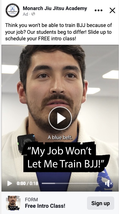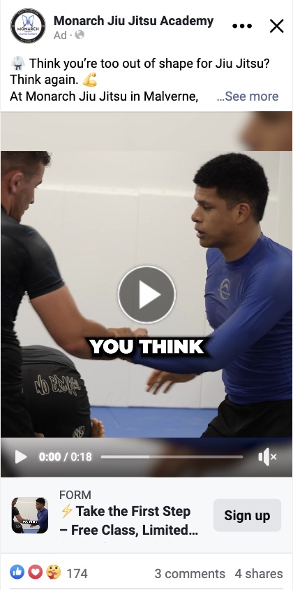 The first campaign I built from scratch for Monarch — a video-led lead gen campaign using interview-style creative to address the biggest objection first-time martial arts students have before signing up. The authenticity of the format drove engagement well above platform norms and established a creative direction we carried forward.