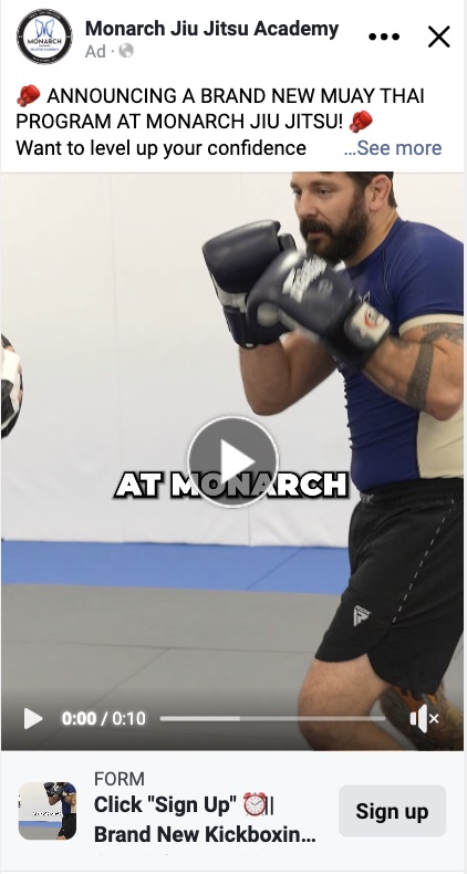 Monarch was launching a new Muay Thai program and needed volume — fast. Built a 3-campaign lead gen series across Facebook and Instagram targeting local adults interested in combat sports and fitness. Each campaign iterated on the last: tightening the audience, testing creative formats, and cutting CPL with every flight.